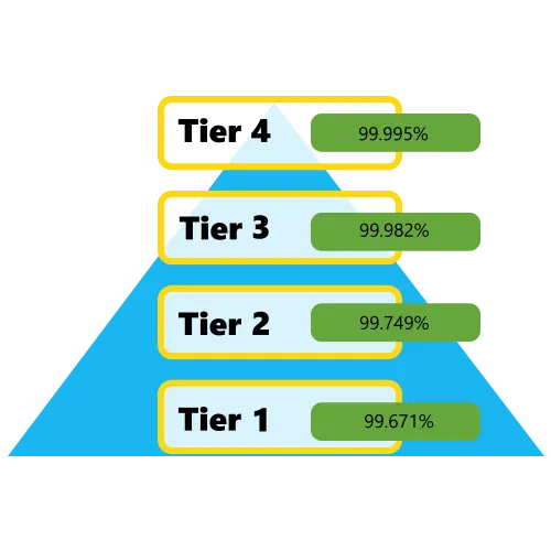 Tier represents the quality of service, infrastructure, security & ability to perform & handle faults. There are tiers 1 to 4 only & tier 4 means that the data center is completely tolerant to all faults. Moreover, it has redundancy for almost every component to provide 99.995% server Uptime.